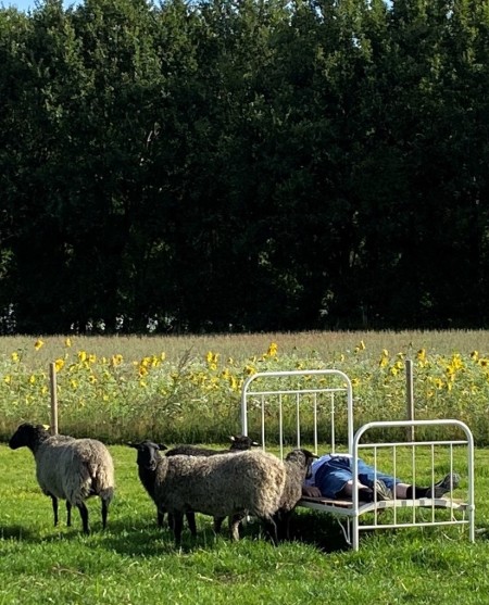 Vi har af samme årsag sat en gammel metalseng ud på folden, så man kan sætte sig og få ro. Og helt naturligt kommer fårene til én og der bliver nusset og snakket.