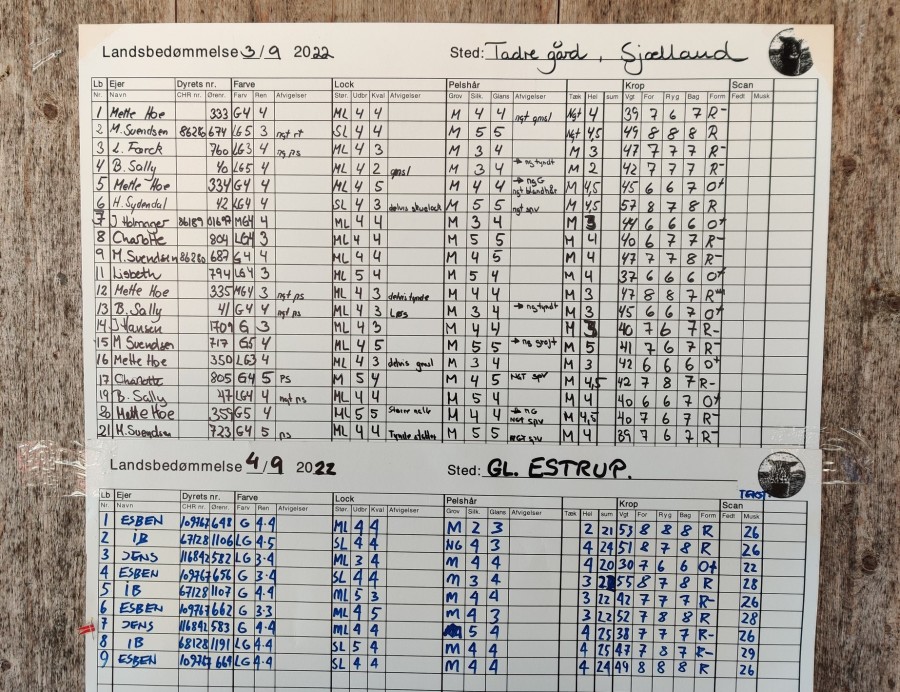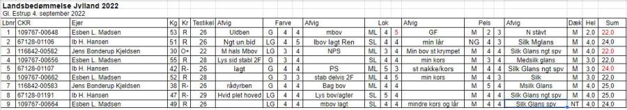 Lbnr. 1 har fået "4-5" i pelshår istedet for "4-4" og der er fejl i sammentællingen for lbnr. 1, 3 og 5.De rigtige tal er markeret med rødt i billedet herunder.Det ændrer dog ikke på helhedspointene.
